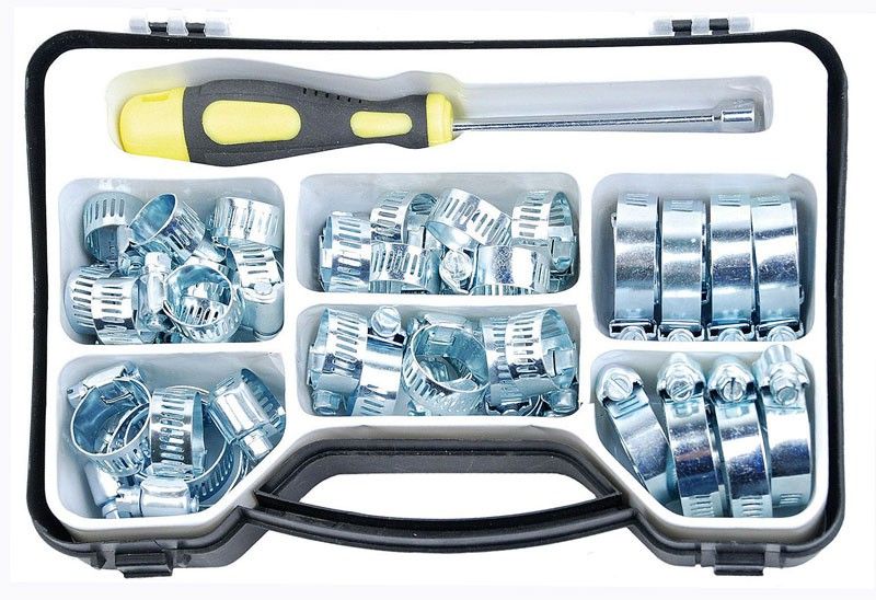 - Een assortiment van wormschroef-slangklemmen voor het bevestigen van slangen, tuiten en buizen.
